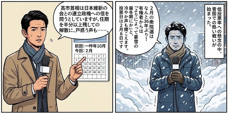 衆院が23日の通常国会冒頭で解散したのを経て、政府は同日の臨時閣議で今衆院選日程を27日公示、2月8日投開票と決定。今回は一昨年10月15日に公示、同28日に投開票した前回から1年3カ月しか経ていないものの、高市早苗首相は日本維新の会との連立政権への信を問う重要な選挙、と強調。