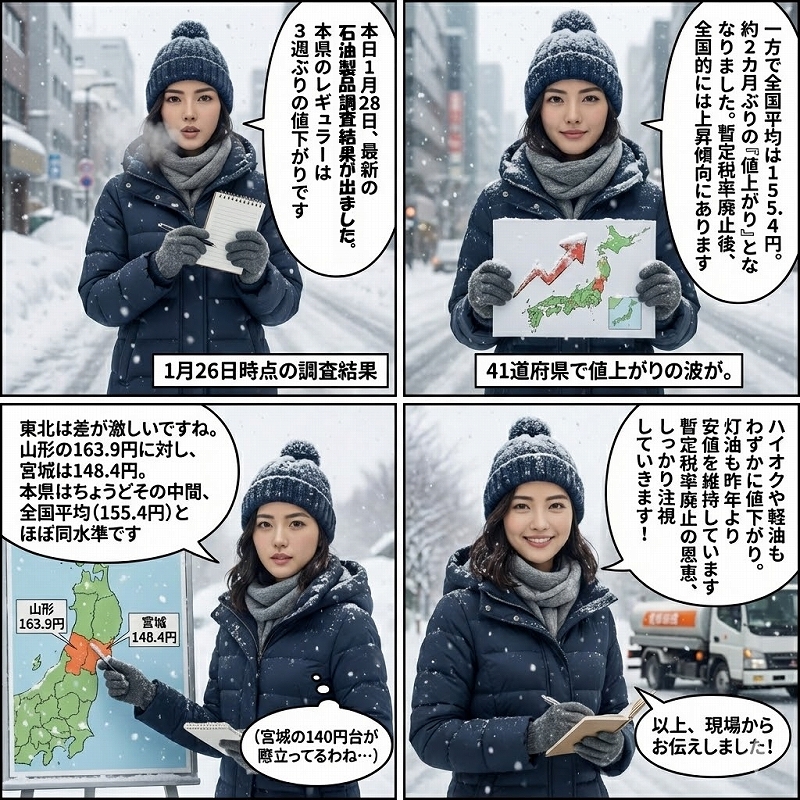 政府は、昨年末でガソリン税の暫定税率(1リットルあたり25.1円)を廃止。1月最終調査によるレギュラーガソリン1リットルあたりの全国平均価格は、前週調査(19日現在)に比べて0.7円高い155.4円となった。値上がりは、前年11月4日調査以来約2カ月ぶり。41道府県で値上がり、1県(岡山)で横ばい、本県を含む5都府県で値下がりした。
